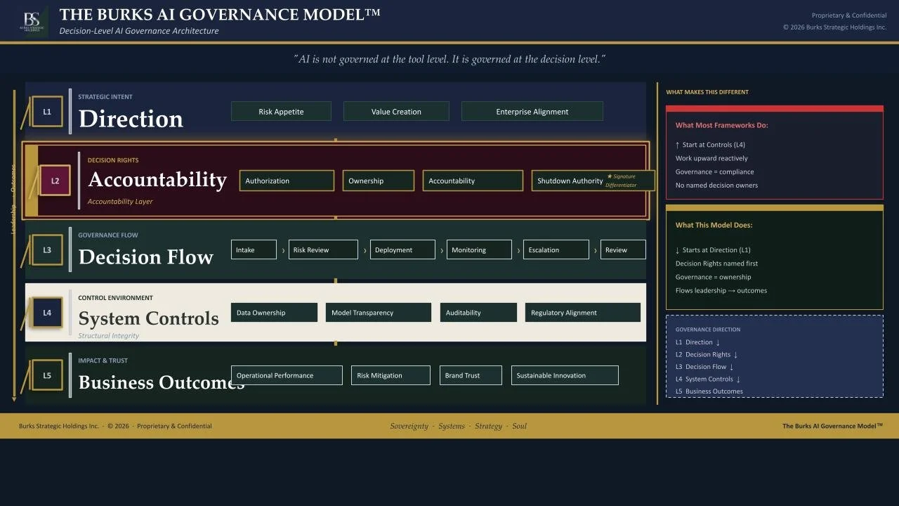 The Burks AI Governance Model™ gives you board-ready architecture with decision rights mapped to executive roles.