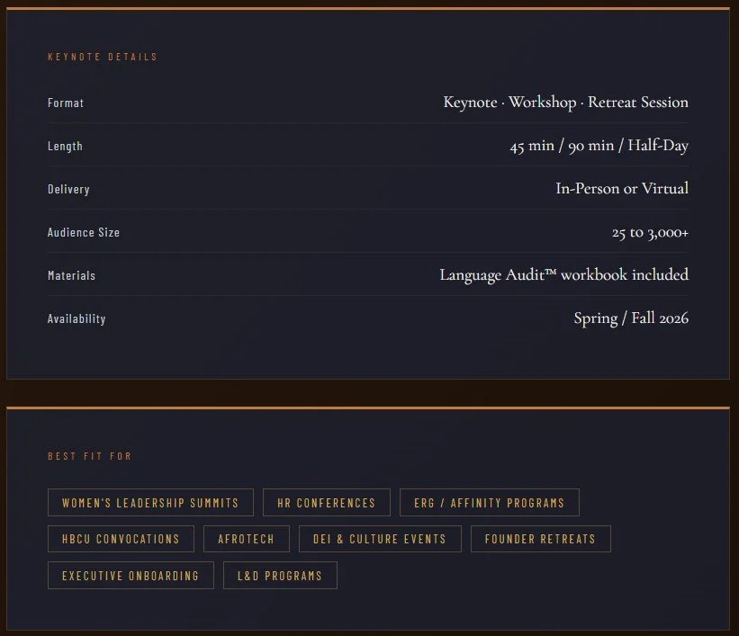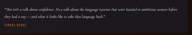 Tamara's keynotes are not motivational speeches. They are strategic frameworks grounded in organizational research, lived experience, and nearly 30 years of watching how language shapes outcomes for women in professional spaces.